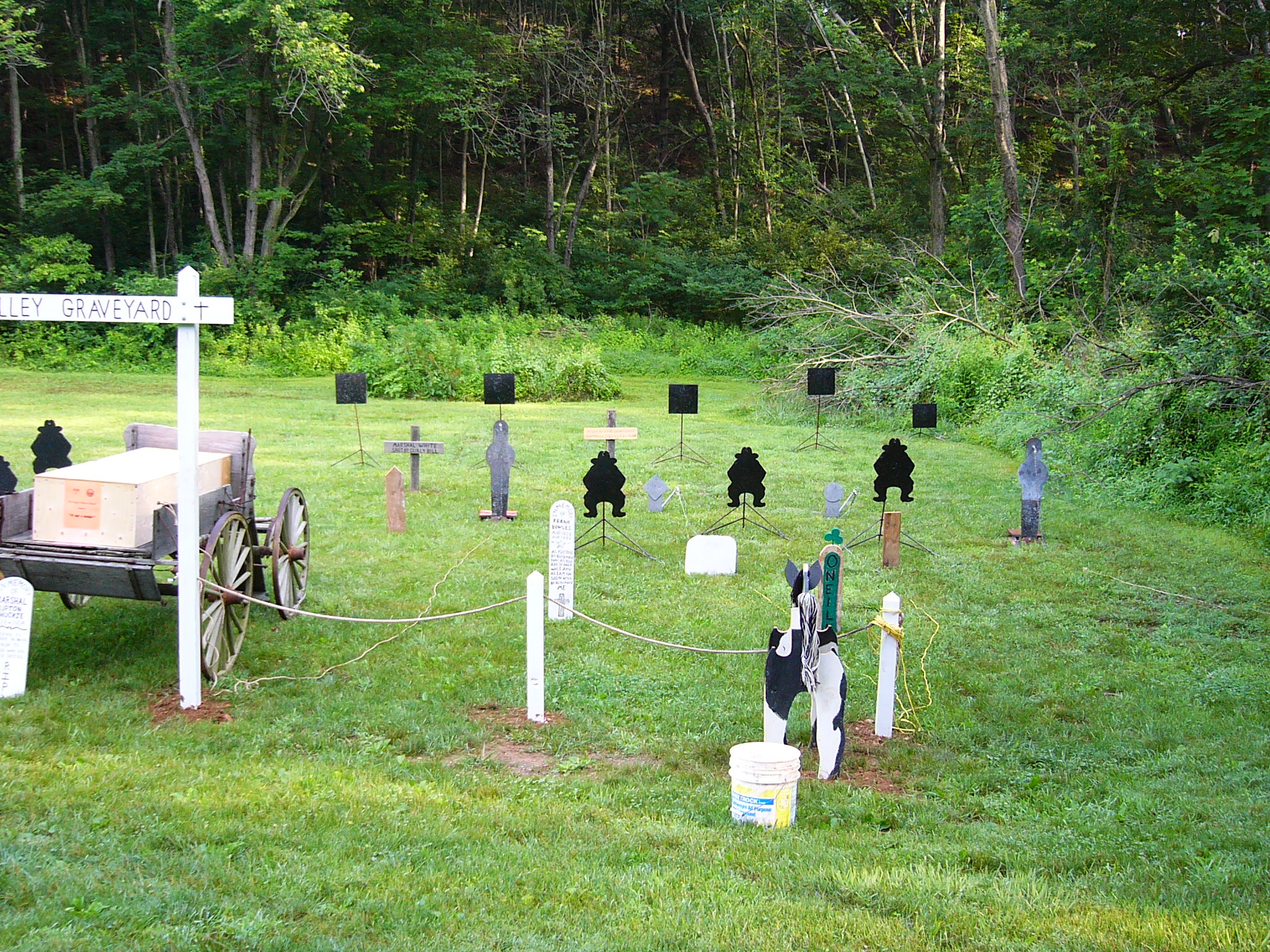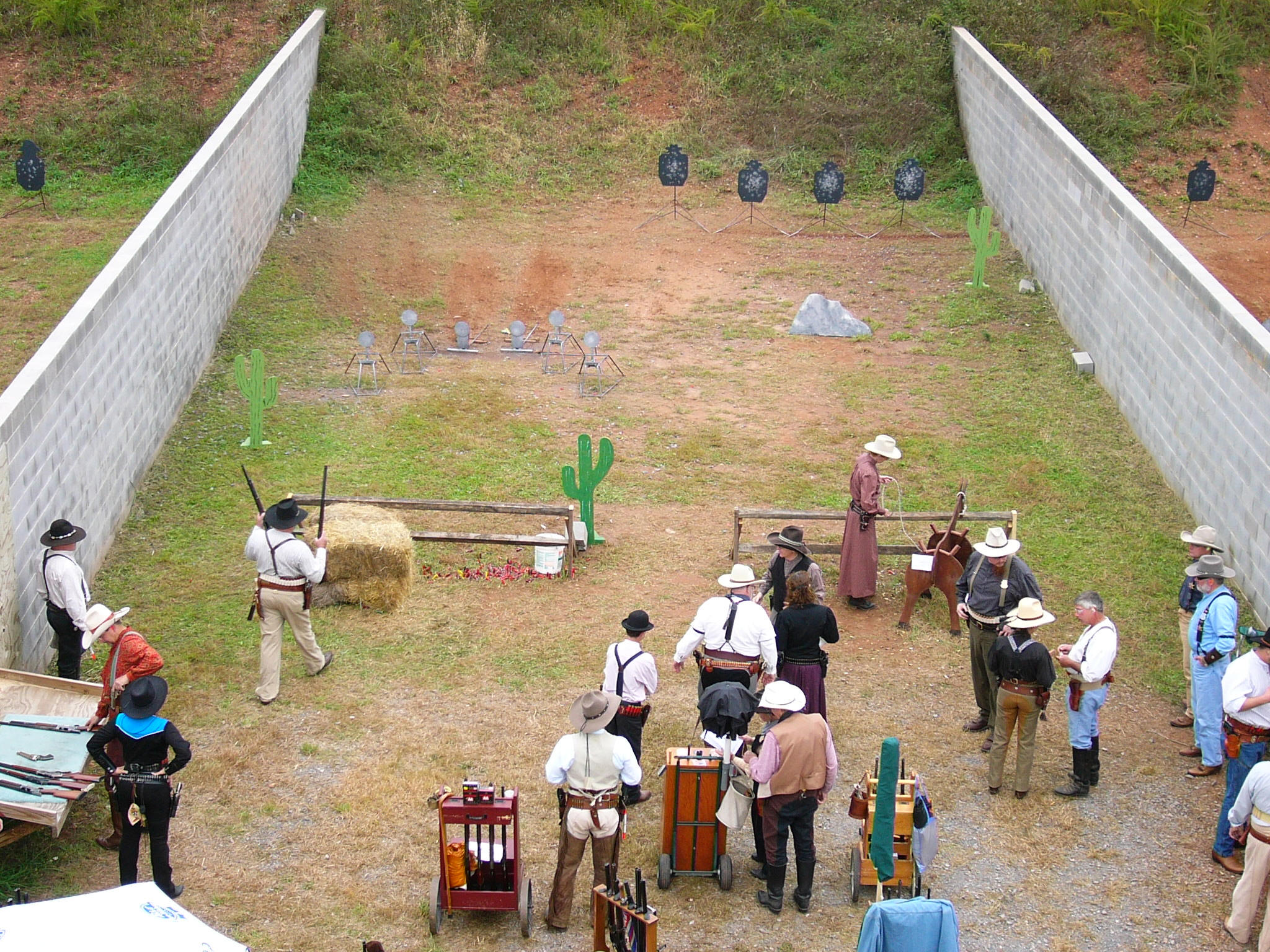 *There are no prizes for winning, just bragging rights until the next match. *Cowboy Action Shooting is shooting scenarios using firearms that are all of 1899 or earlier in design or manufacture. This includes rifles, pistols and shotguns. *Matches are not quick draw contest. *Cowboy Action Shooting is NOT the place to learn how to shoot. It is where experienced shooters go to play the fantasy of Cowboy Action Shooting. *The "Spirit Of The Game" is a term we use to describe the honor of the old west, a handshake was your bond and honesty was the rule of the day. It also means the shooter fully participates in what the stage requires. (Common-sense exceptions are made for those shooters with physical disabilities that hinder participation in certain activities. For example, a wheelchair-bound shooter is not expected to mount the "horse" in the middle of a stage). *If in doubt, just remember "WWJWD" (What would John Wayne do?) *Remember, No target is to close or to big, that it can't be missed. And remember, It ain't how good you shoot, it's how good you look shooting! |